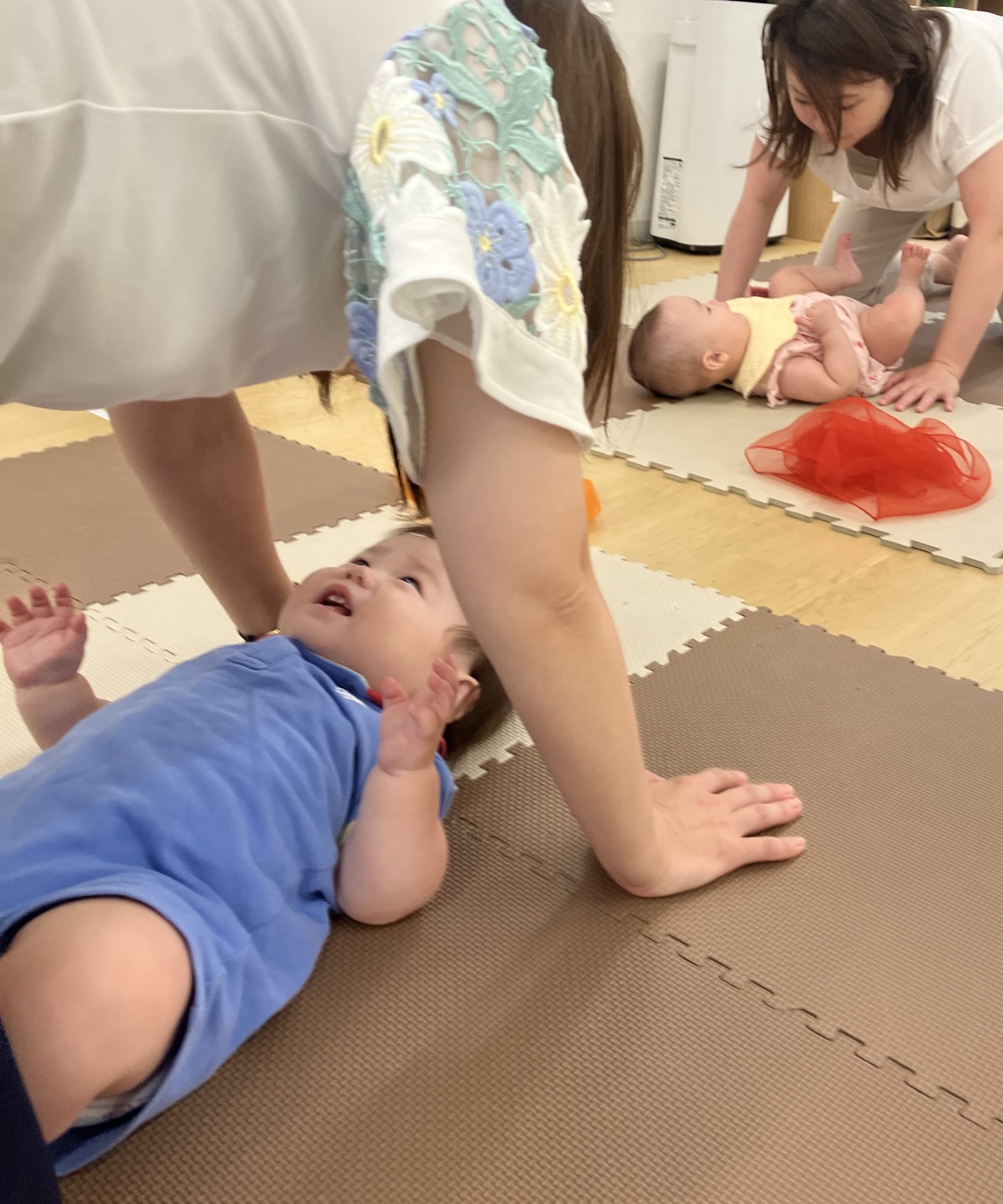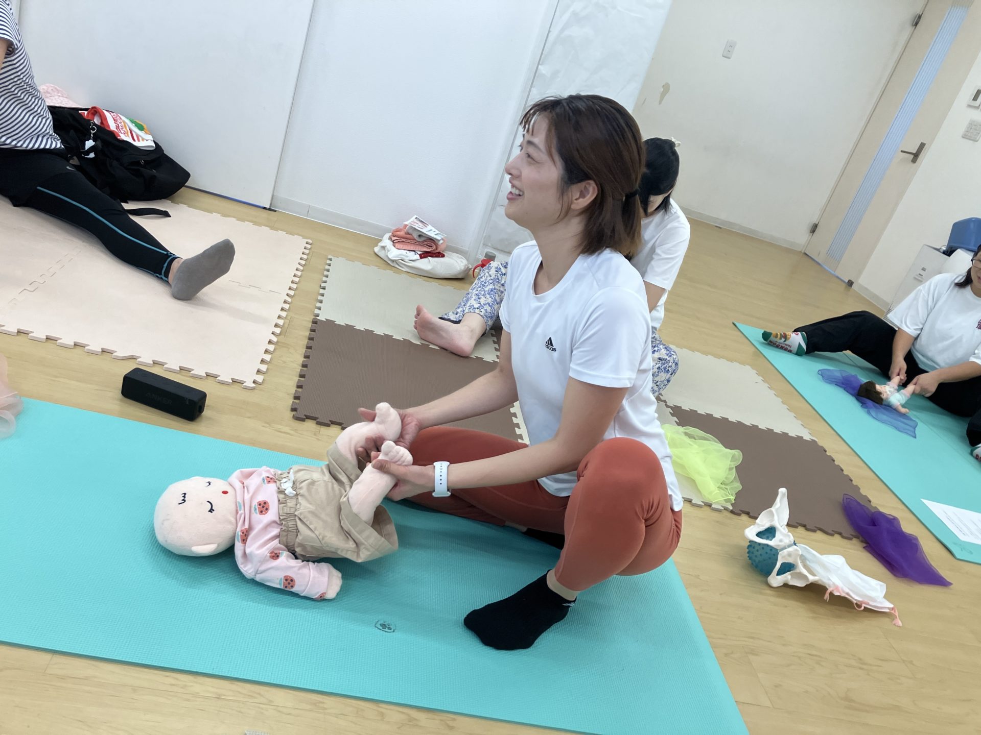 『赤ちゃんと一緒に通える産後のアフターヨガ教室』赤ちゃんへの声掛けや触れ合いを通して、親子で安心感と絆を育み、はじめての性教育にもふれる時間。赤ちゃんと一緒に過ごしつつも、ママパパのカラダも労わる時間に。姿勢と呼吸・骨盤底筋を意識したガスケアプローチを取り入れています。