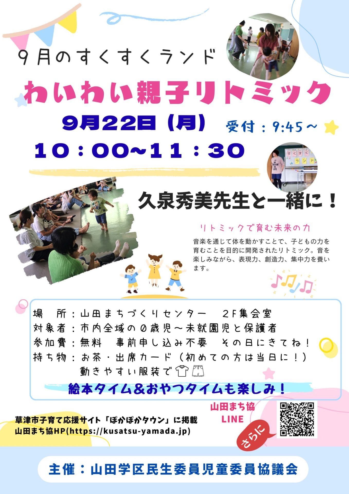 ということで、すくすくランドに、お馴染みの「久泉秀美先生」をお迎えして、触れ合い遊びや集団遊びなど、わいわいと楽しく親子で遊びましょう。どんな遊びが飛び出すのかとっても楽しみ・・・
