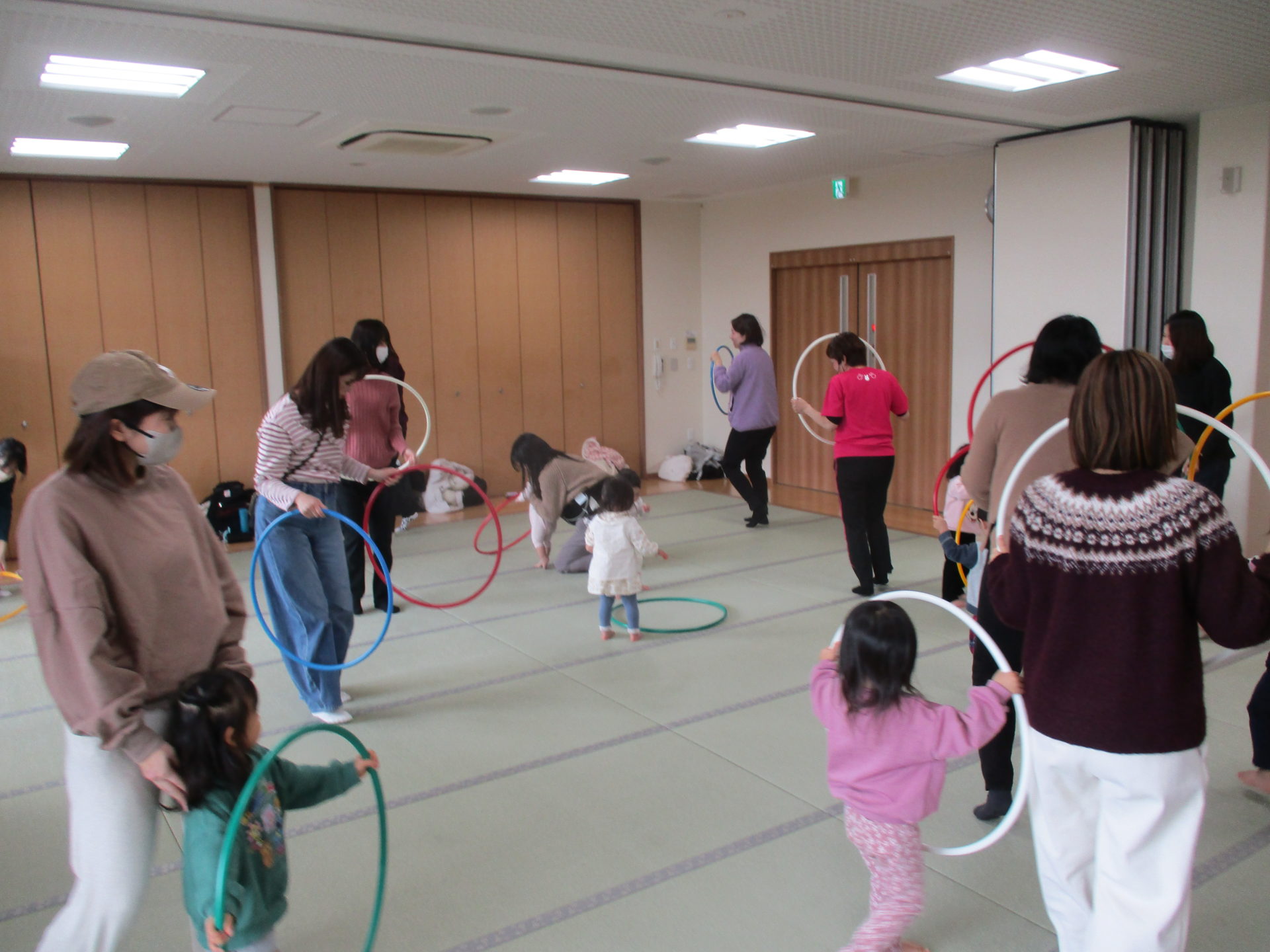 親子でふれあい遊びやフープ遊び等、体をいっぱい使った遊びをします。