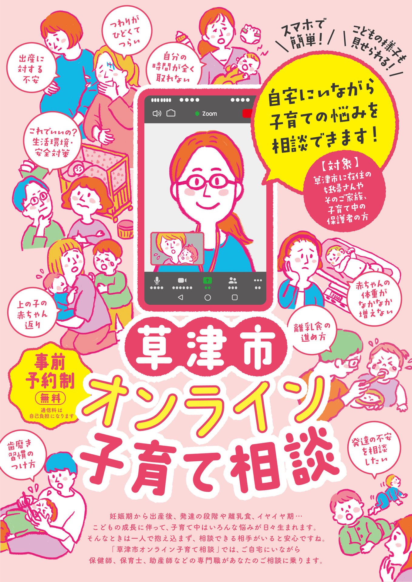 対象は、草津市に在住の妊婦さんやそのご家族、子育て中の保護者の方で、
